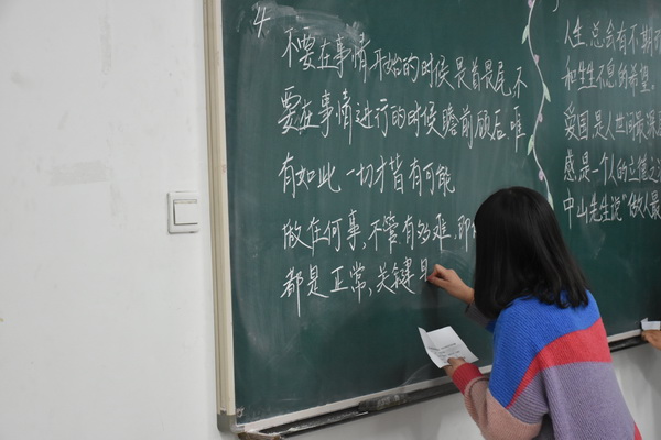 韩国色情 一直致力于学生全面发展,重视学风建设,开展了以就业质量提升为目的的第二课堂活动,安排专业老师为同学们练习板书、普通话、讲课技能进行指导。此次活动为同学们提供了相互切磋、展示自我的平台,加深了同学们对书法的认识和了解,提升了同学们的艺术修养和审美能力。